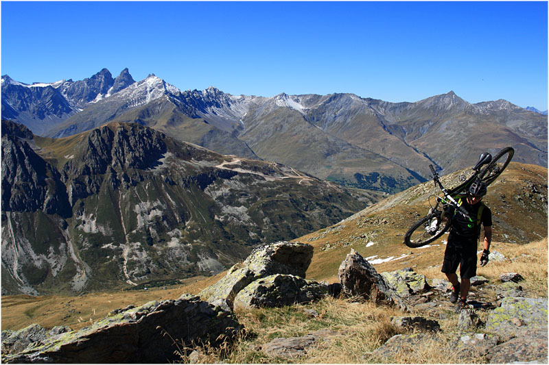 choisir les bonnes conditions pour aller jouer en montagne.La neige dans la pente finale nous a donc privés du sommet en vélo, et il faudra revenir. Car la qualité de la descente vaut bien les efforts du portage du vélo en altitude: c'est beau, technique, varié et exceptionnel.